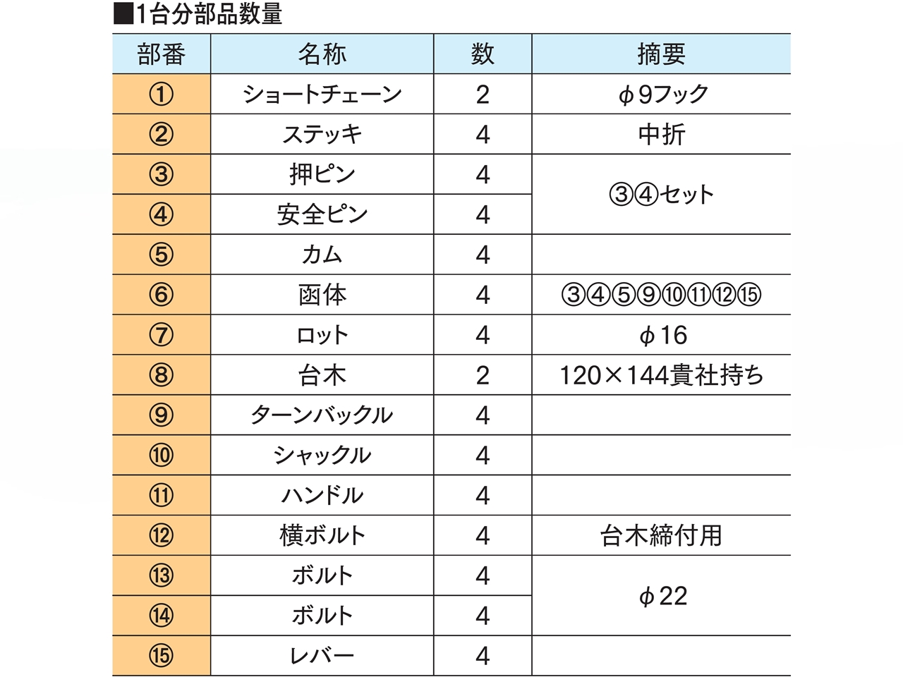 尺寸//盒子:高125 x 长650mm(4个/套)重量:114kg,手杖:厚36 x 宽105 x 长:1900mm(4个/套)重量:164kg,短链:直径9 x 长3500mm,1个(4个盒子+4个手杖)重量:278kg