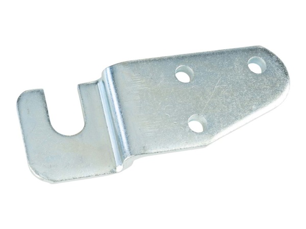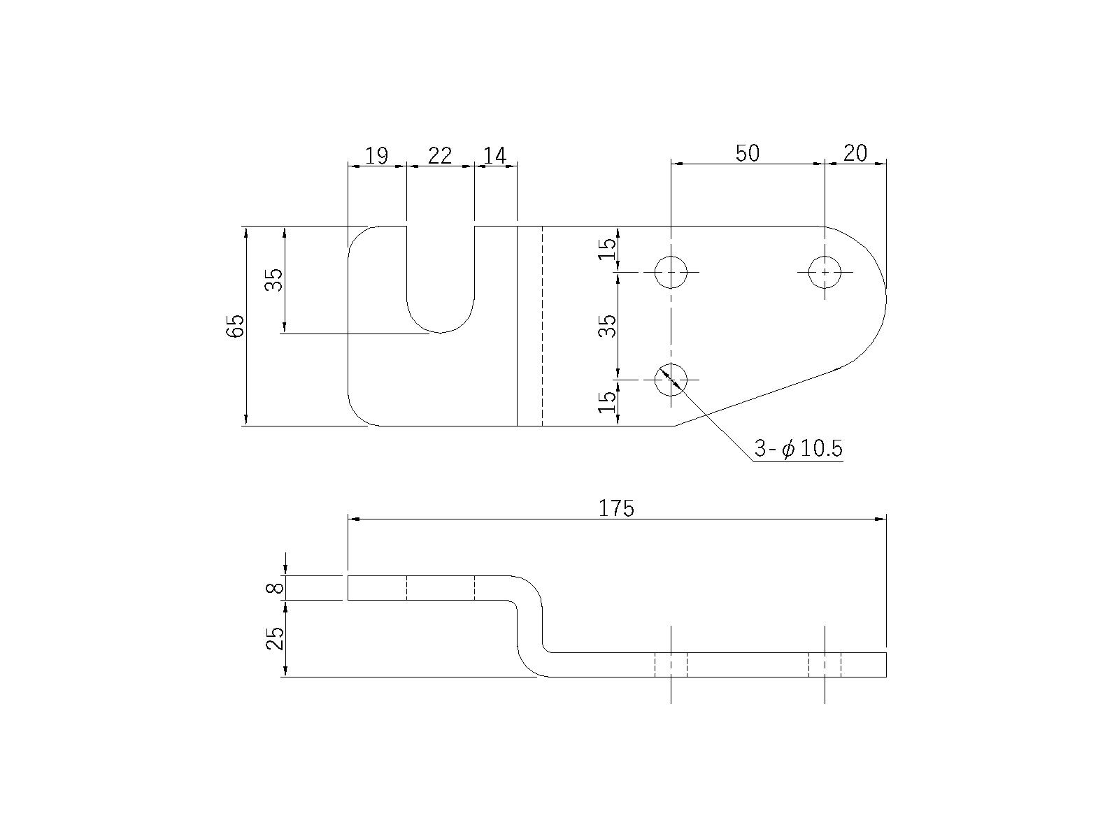 A general-purpose iron catch. The width of the cap is 22 mm, and it fits 16 mm and 19 mm latch handles. It is a 25 mm stepped type. It has three holes for 10 mm bolts, making it suitable for installation on an aluminum block.