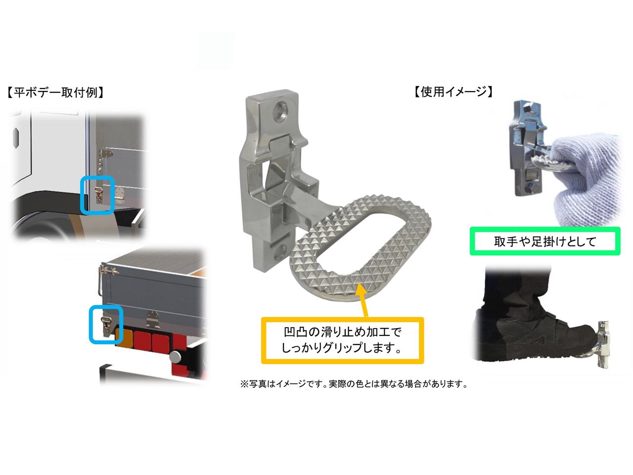 When climbing up or down on the cargo bed, hold onto the handle attached to the cargo bed and place your foot on this product, making sure to maintain three points of support with your hands and feet.