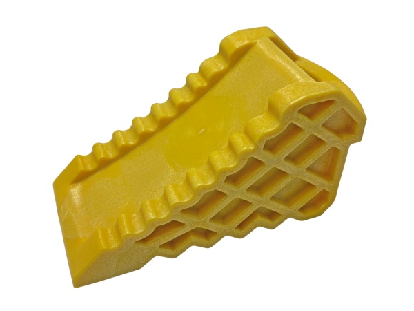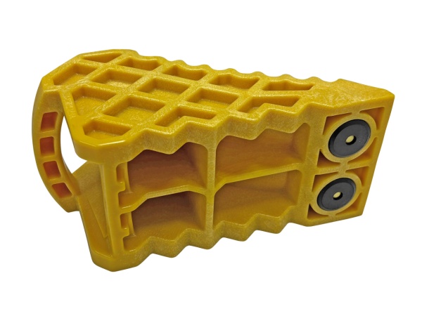 トレクスに純正採用された、トラック車輪止め/歯止めです。重量は、1kgを大きく下回る0.8kg/個で非常に軽く、女性でも軽々設置が可能です。黄色ですので、車輪からの外し忘れ対策にも有効です。