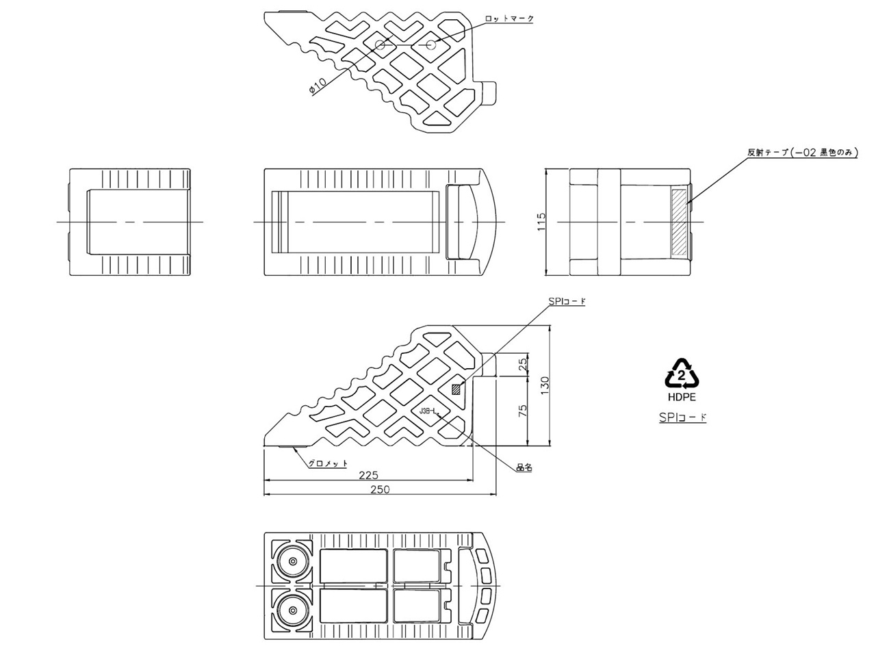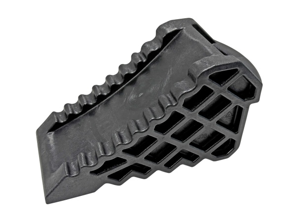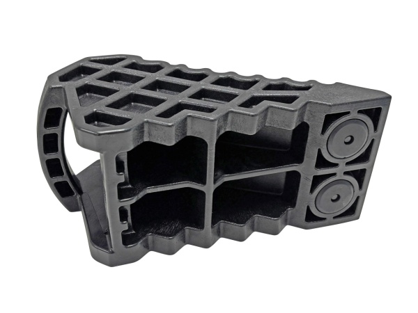 トレクスに純正採用された、トラック車輪止め/歯止め 黄色と同寸法の黒色です。重量は、1kgを大きく下回る0.8kg/個で非常に軽く、女性でも軽々設置が可能です。黒色には、取っ手の下側に反射テープが付いております。