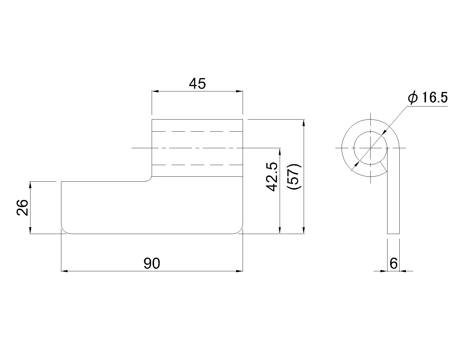 Dimensions // Width: 90 x Height: 57 mm, Plate thickness: 6 mm, Hole diameter: φ16.5, Weight: 0.25 kg